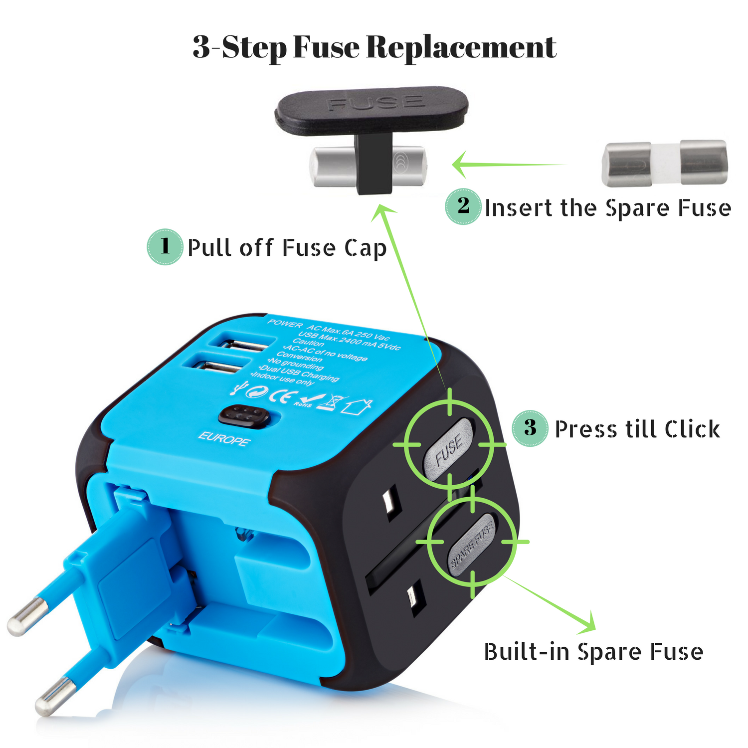 PORS-ELA 2.4A Dual USB International Travel Power Adapter with Safety Fused European, UK, US, AU Plugs, Spare Fuse & Gift Pouch - Super Versatile & Durable (Blue)