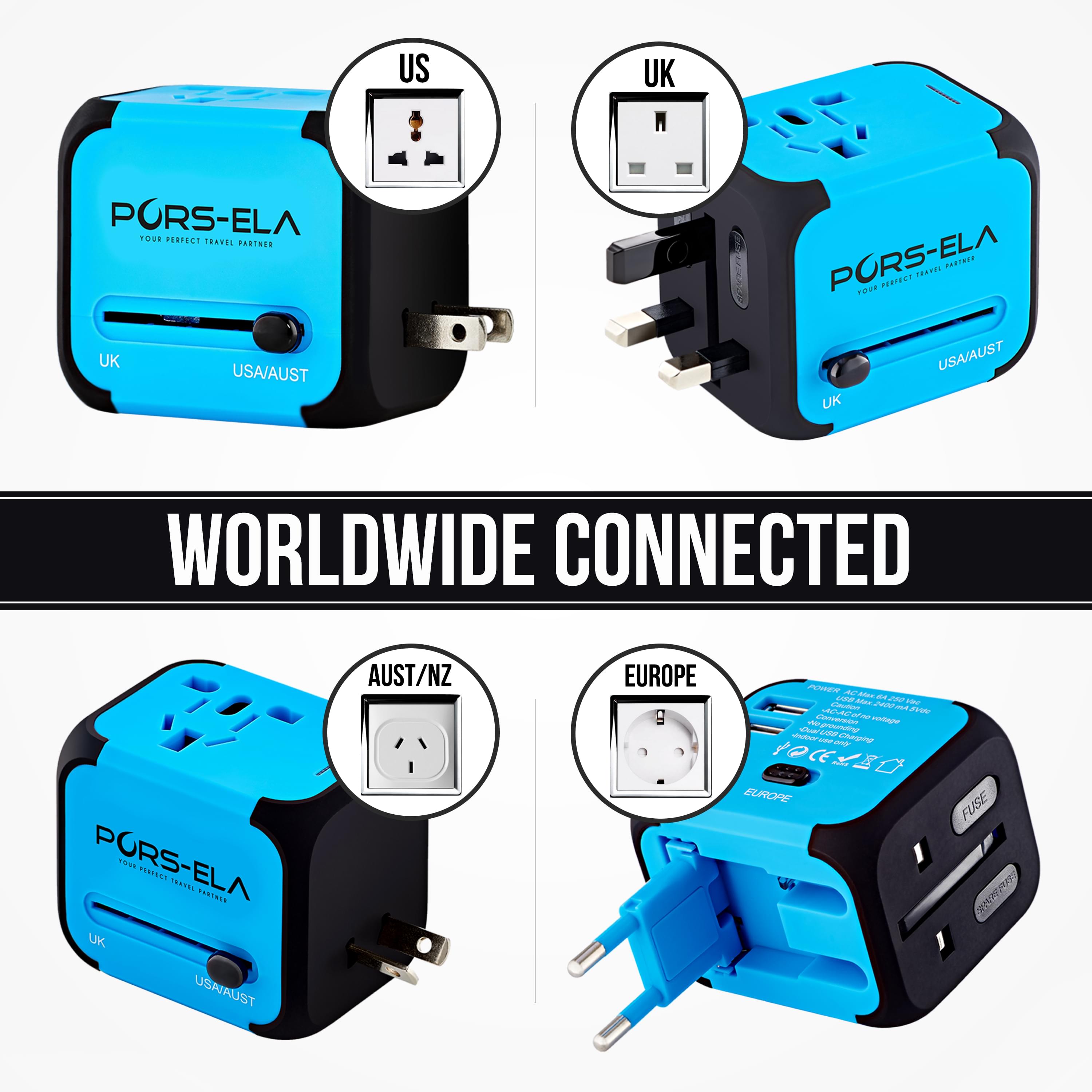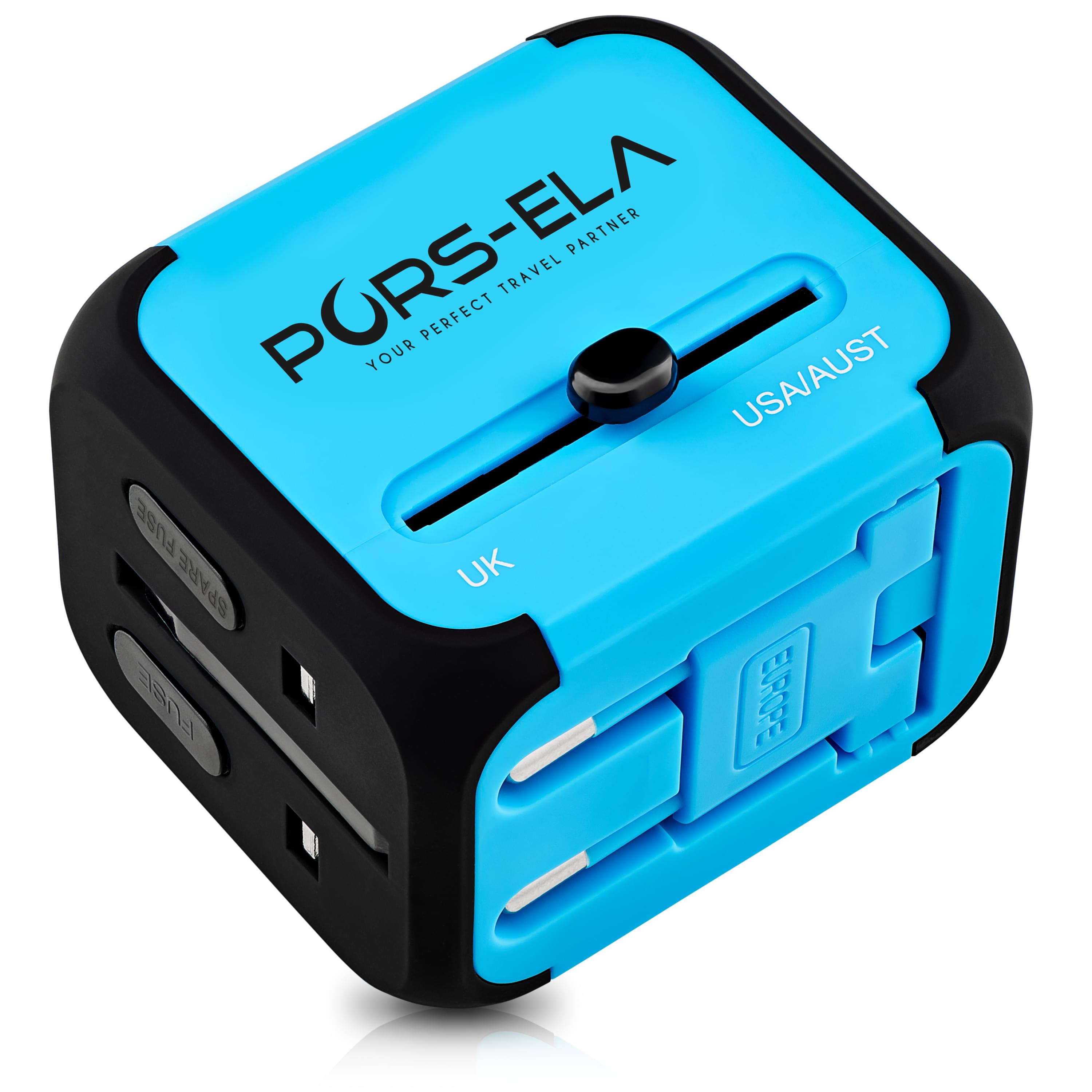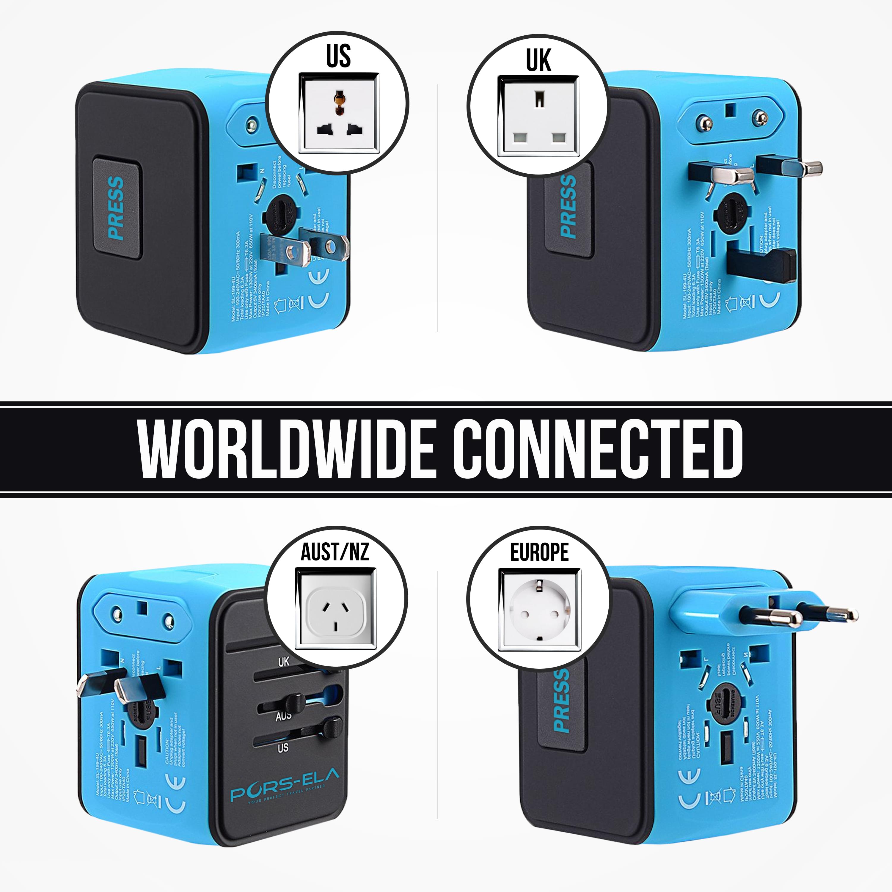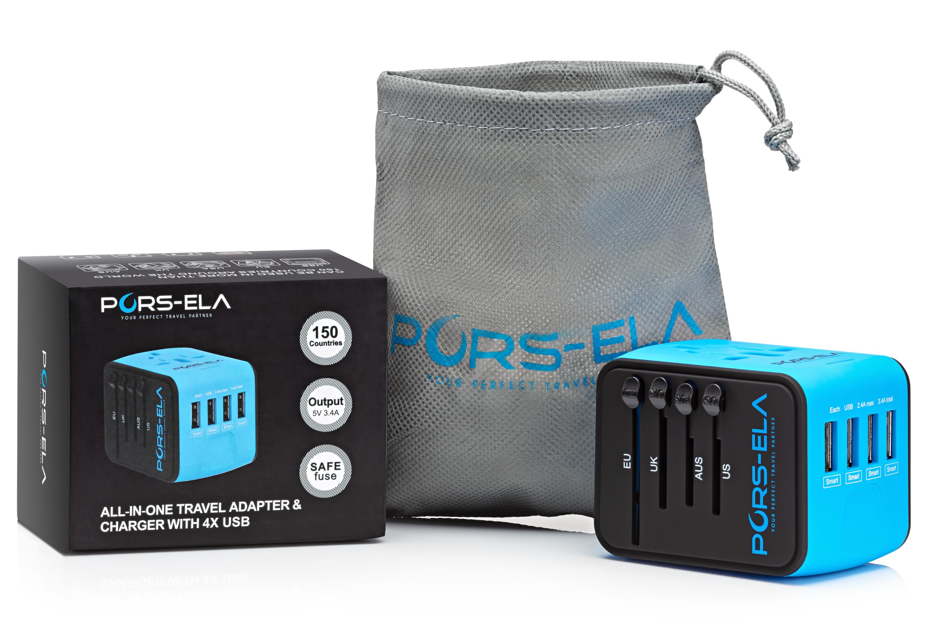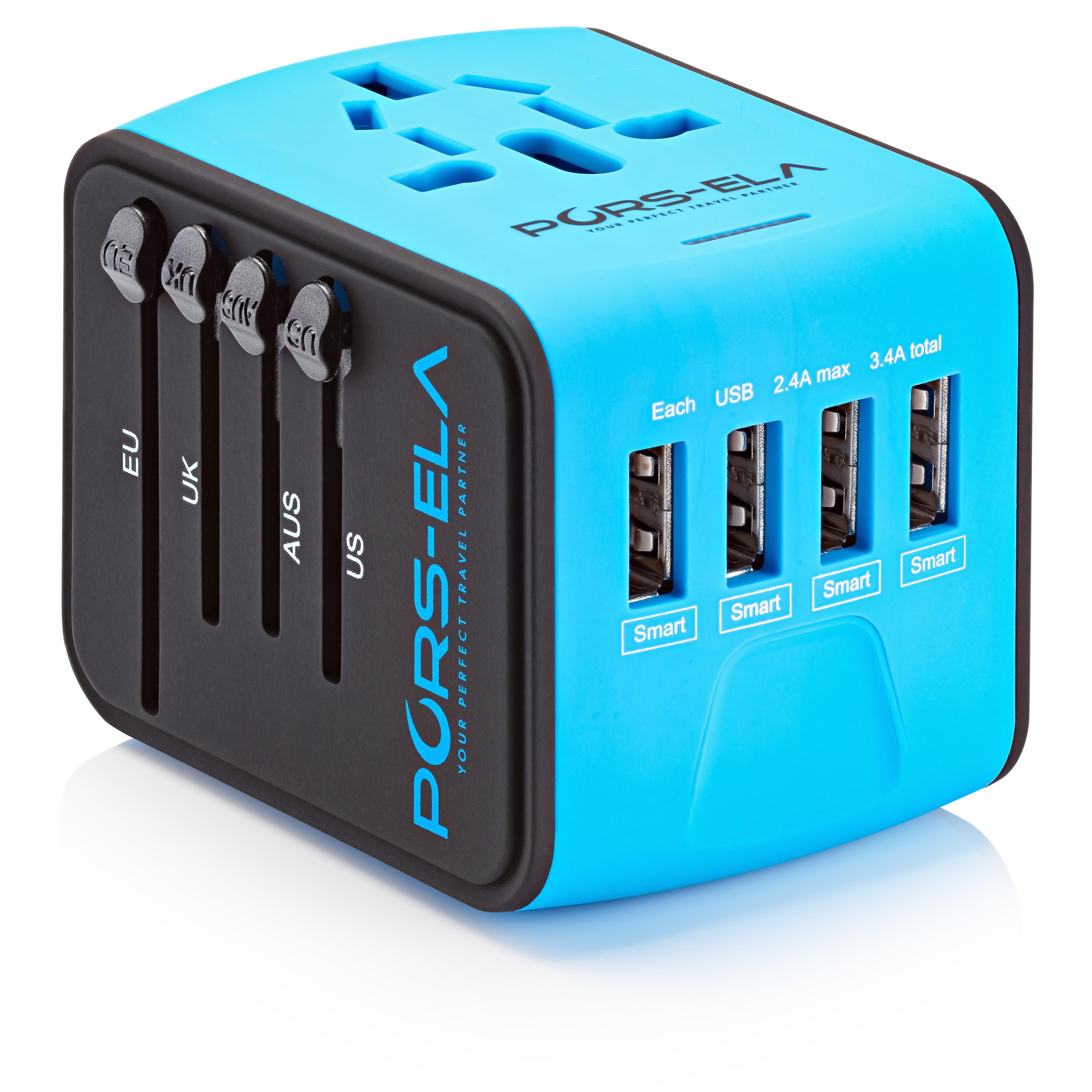 PORS-ELA International Travel Power Adapter with 4 USB 3.4A Charger & Worldwide AC Wall Outlet Plugs for UK, US, AU, Europe & Asia - Safety Fused, Gift Pouch (Blue)