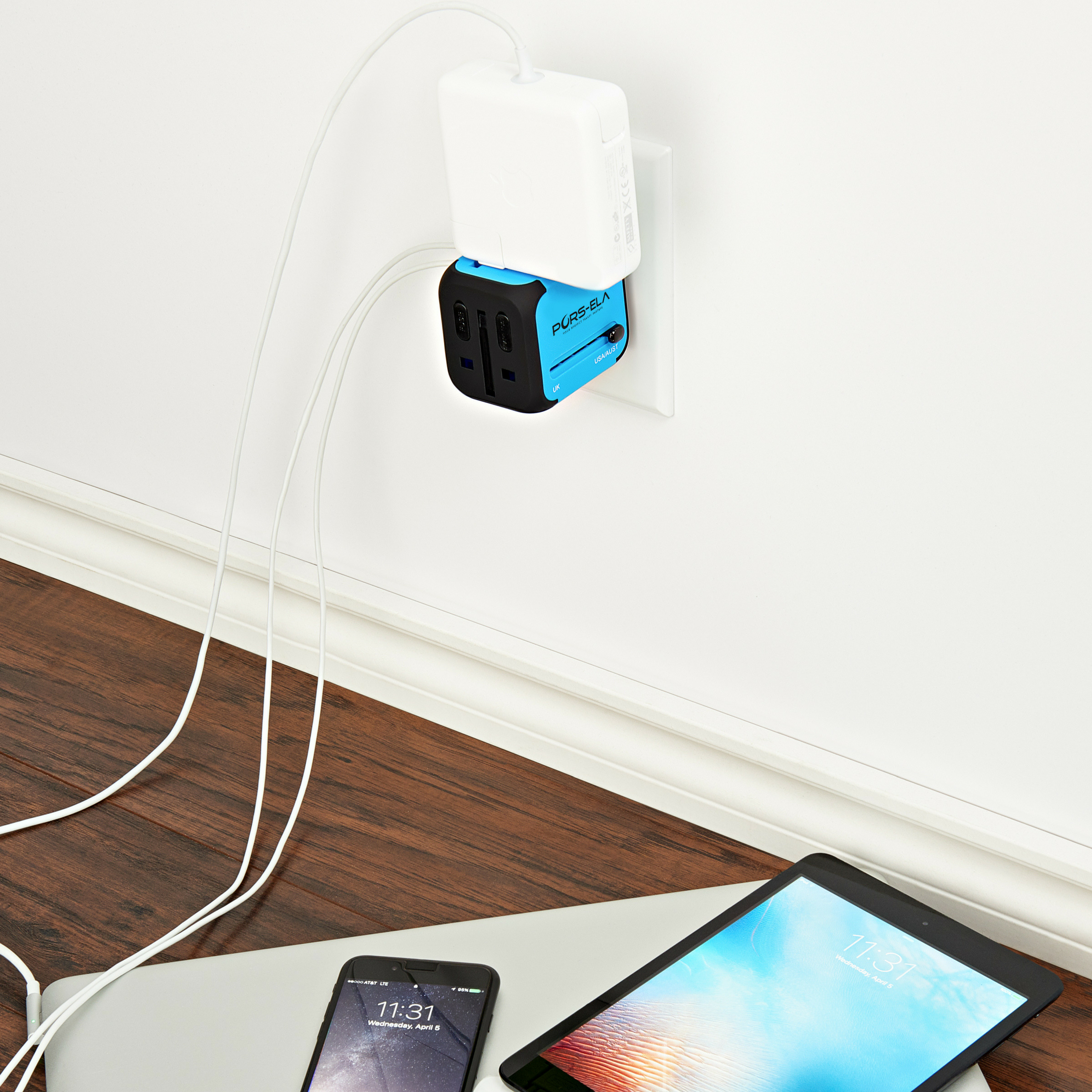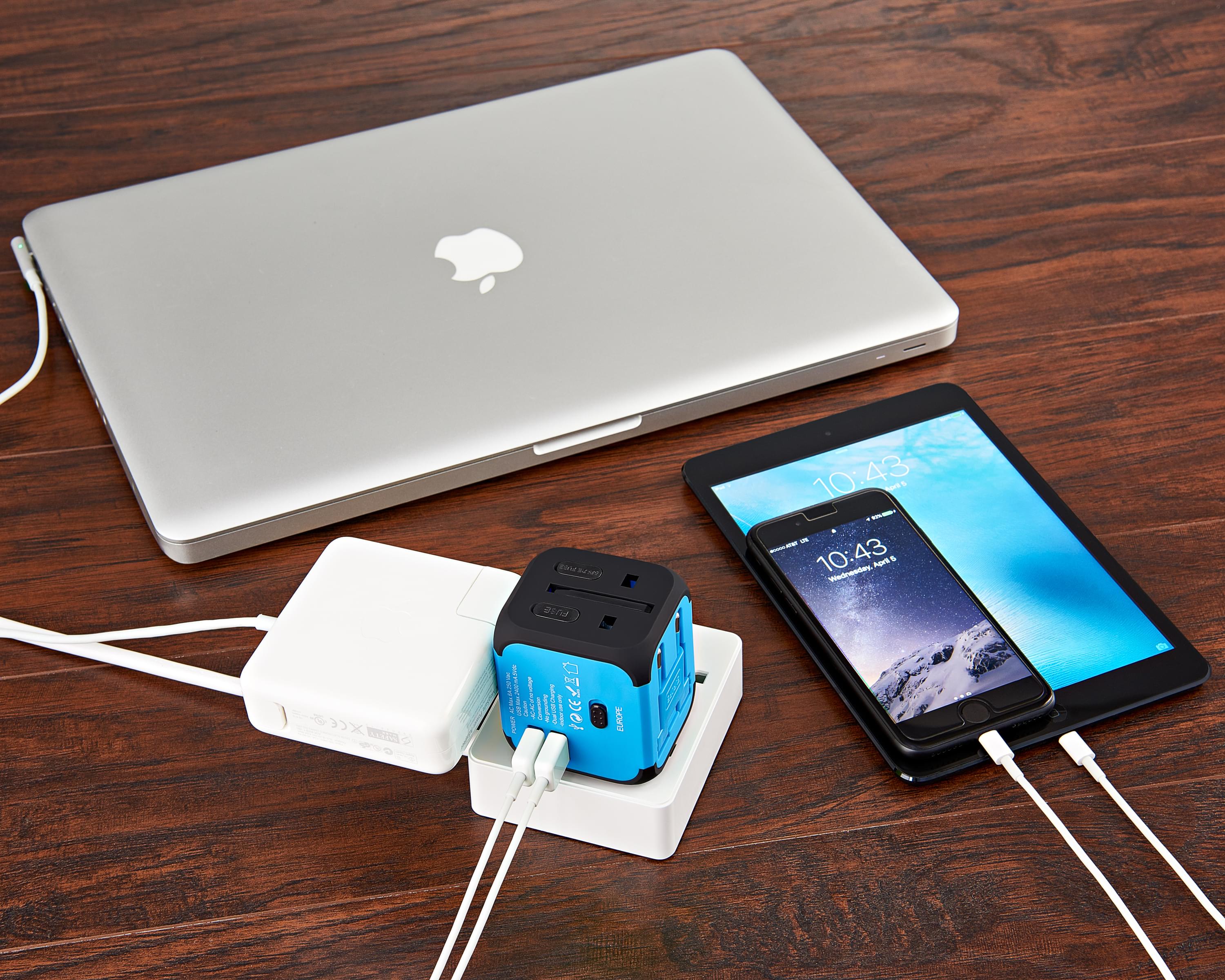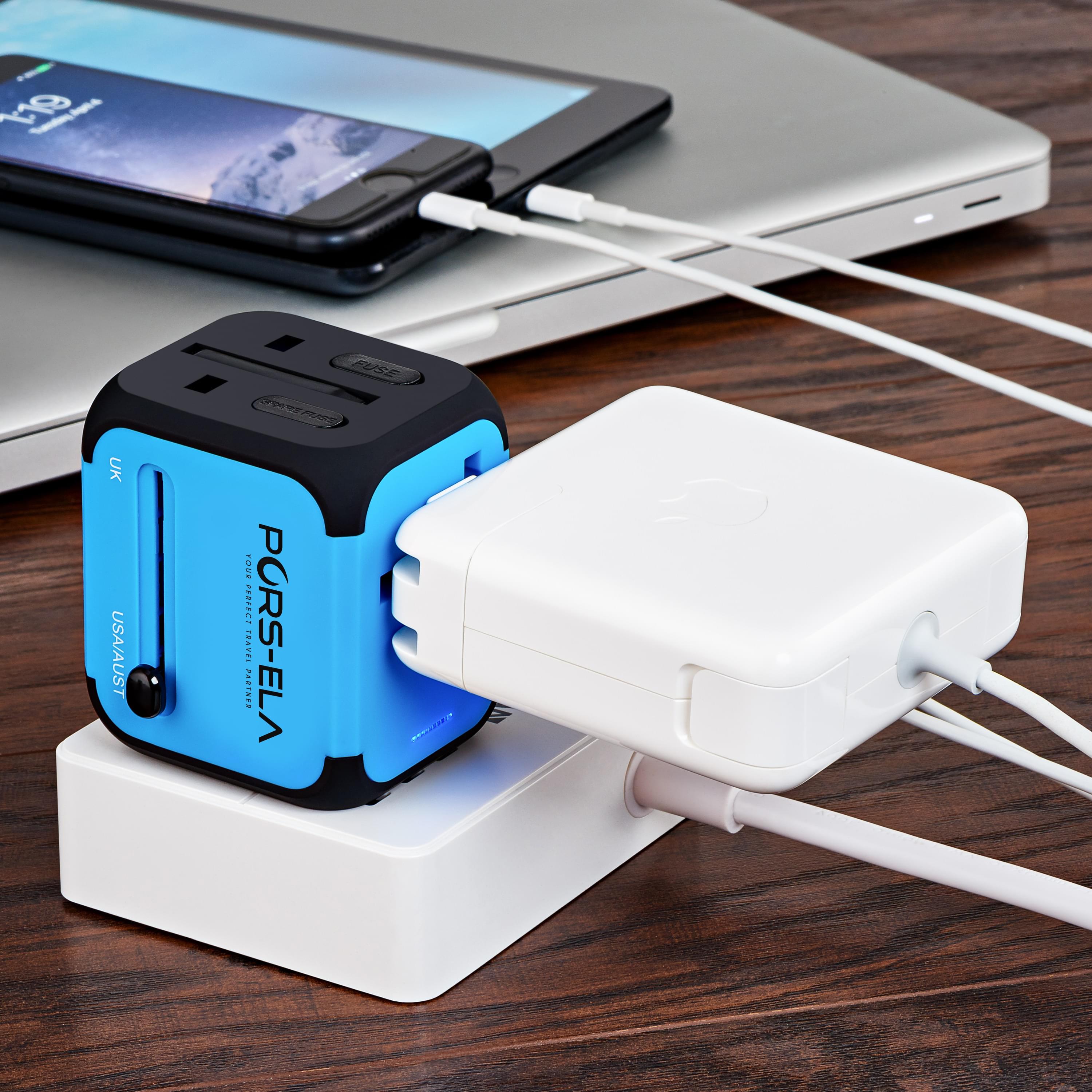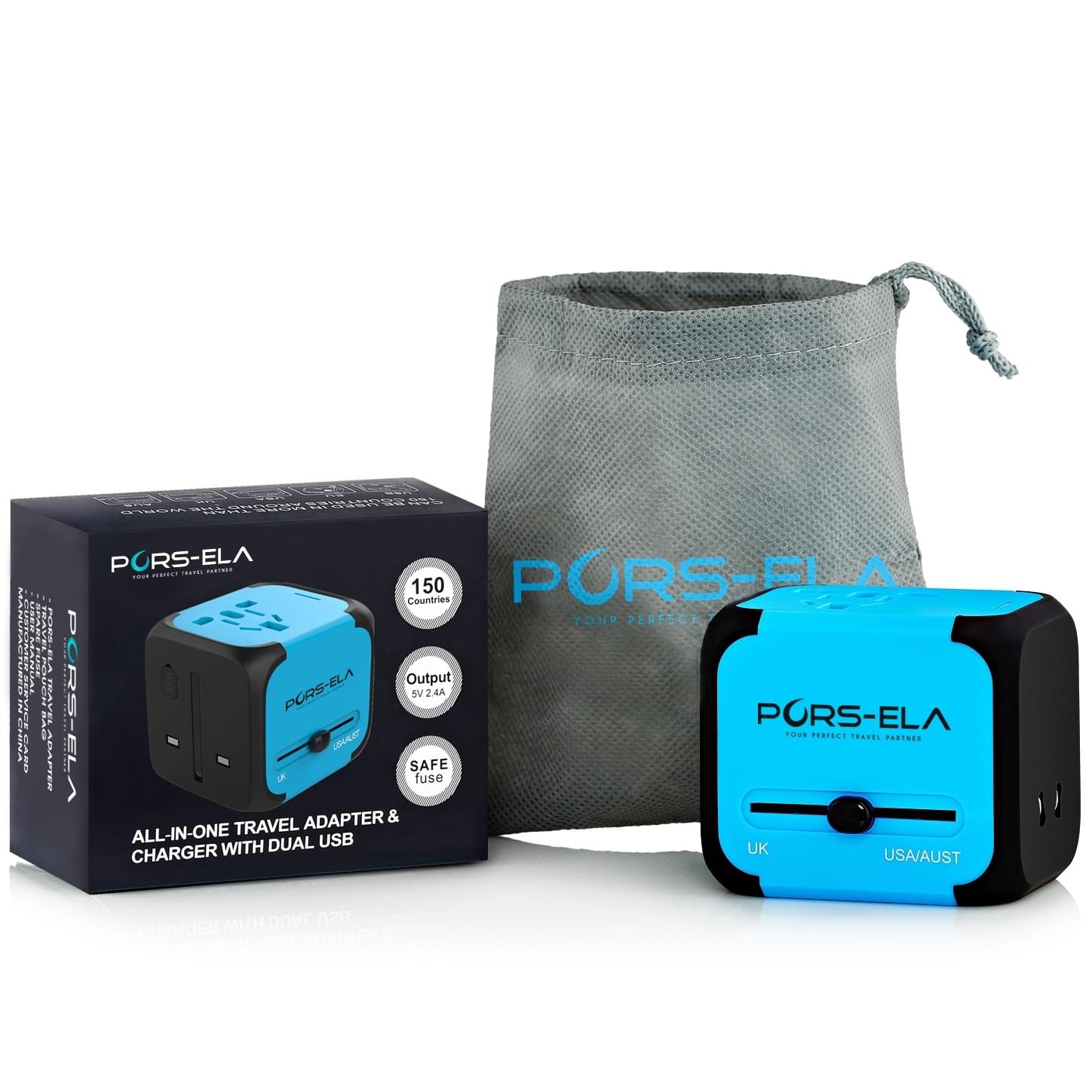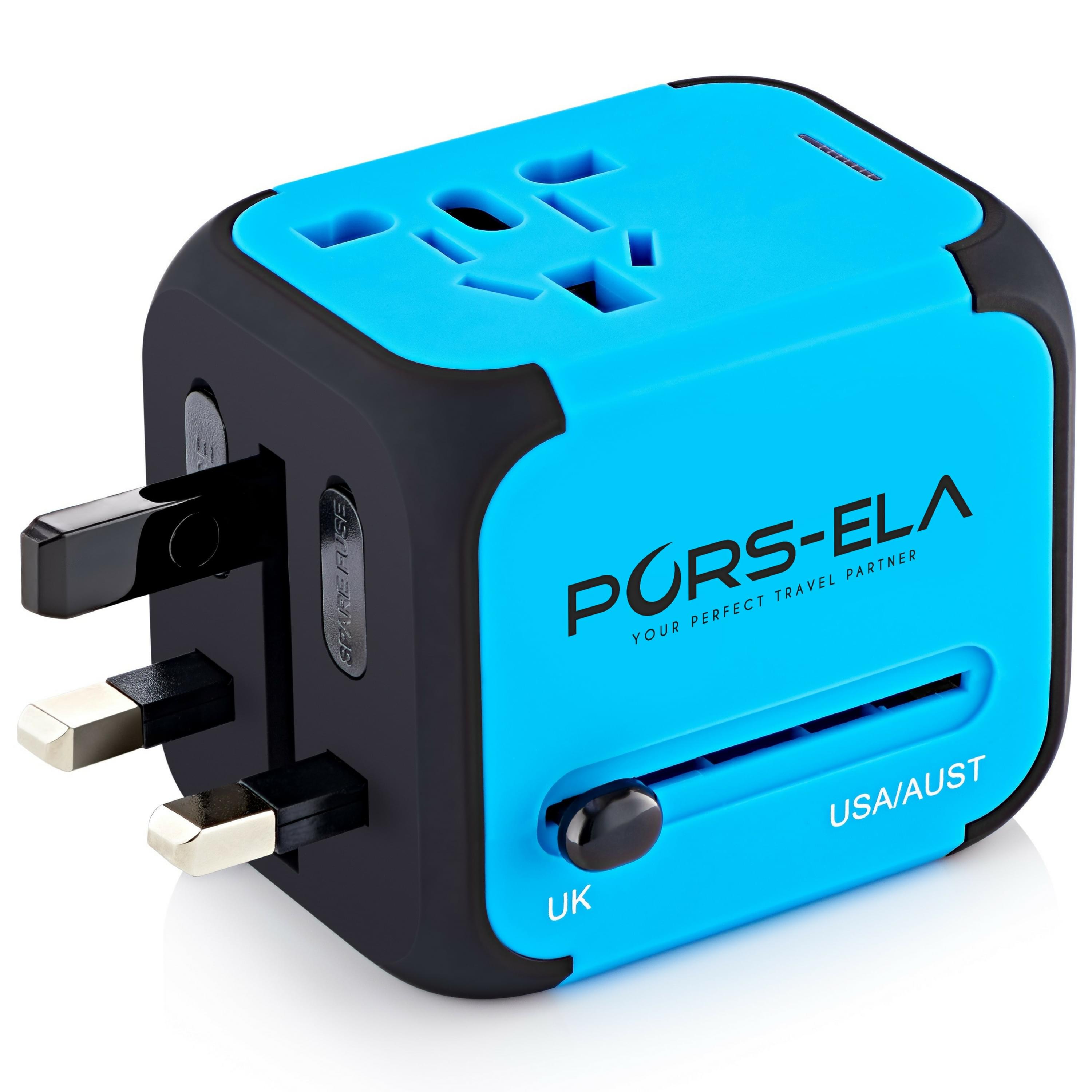 PORS-ELA International Travel Power Adapter with 4 USB 3.4A Charger & Worldwide AC Wall Outlet Plugs for UK, US, AU, Europe & Asia - Safety Fused, Gift Pouch (Blue)