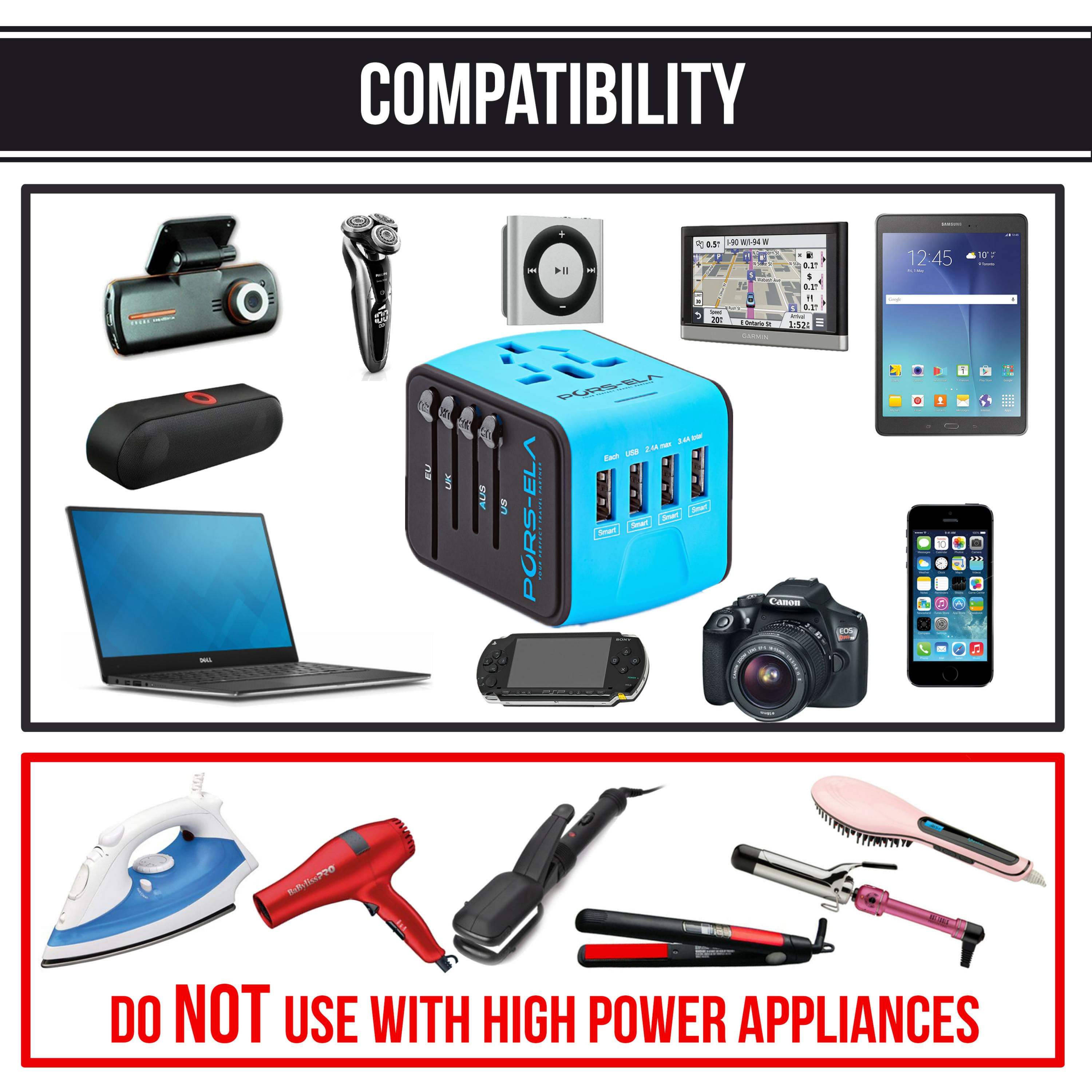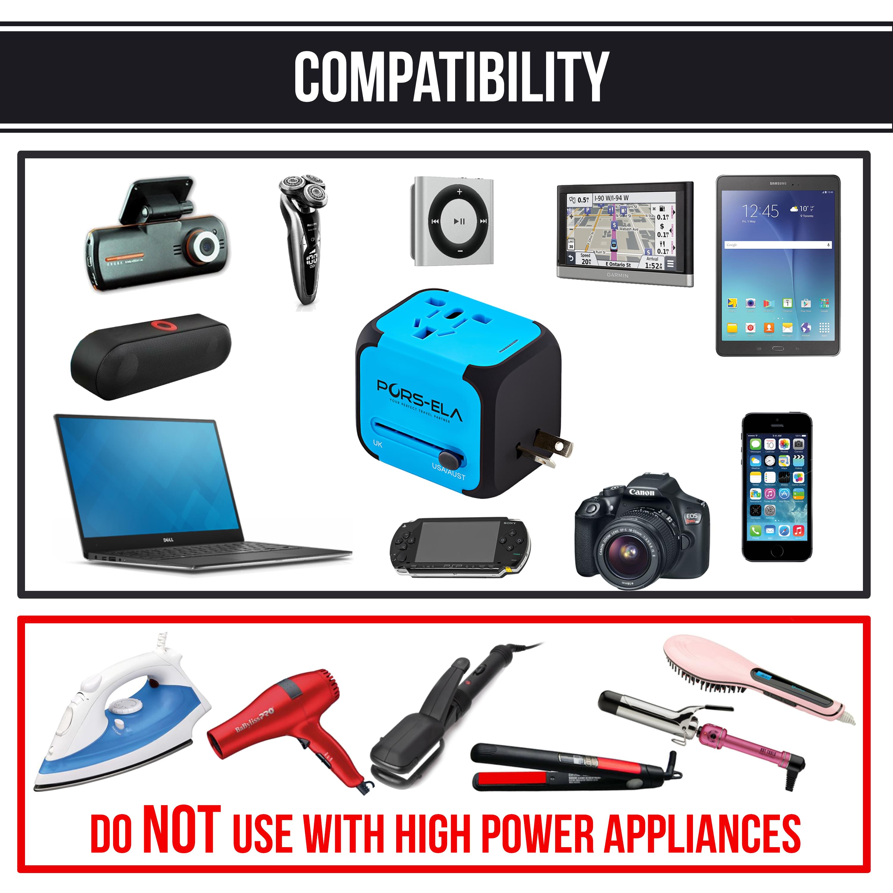★ NOTE: This worldwide travel adaptor is not a converter. It does NOT convert or transform voltages. Please make sure that the voltage of your device is compatible with the countries' voltage where you are traveling to. It does not work with high power appliance such as hair dryer, hair curler, hair straightener, hair iron, steam iron, coffee machine, kettle, etc.